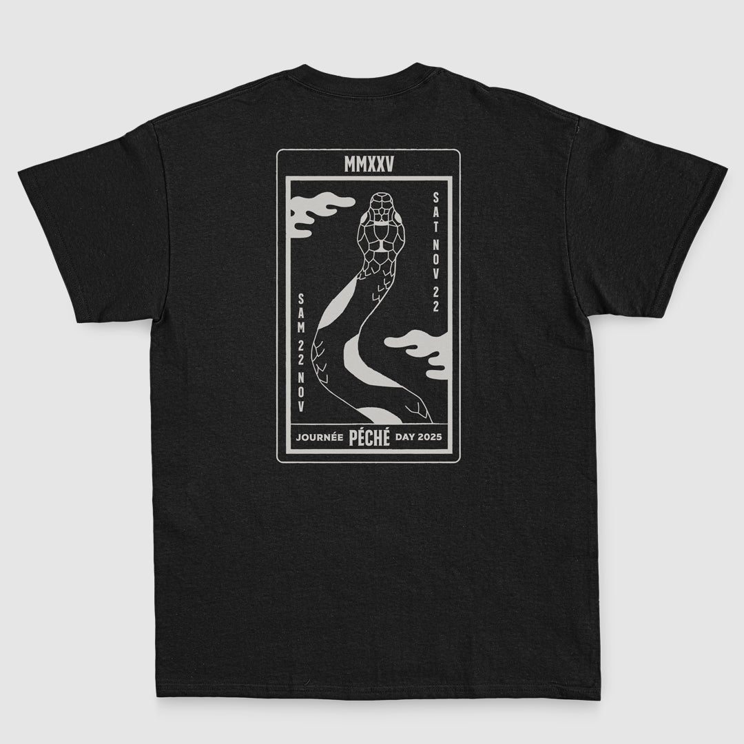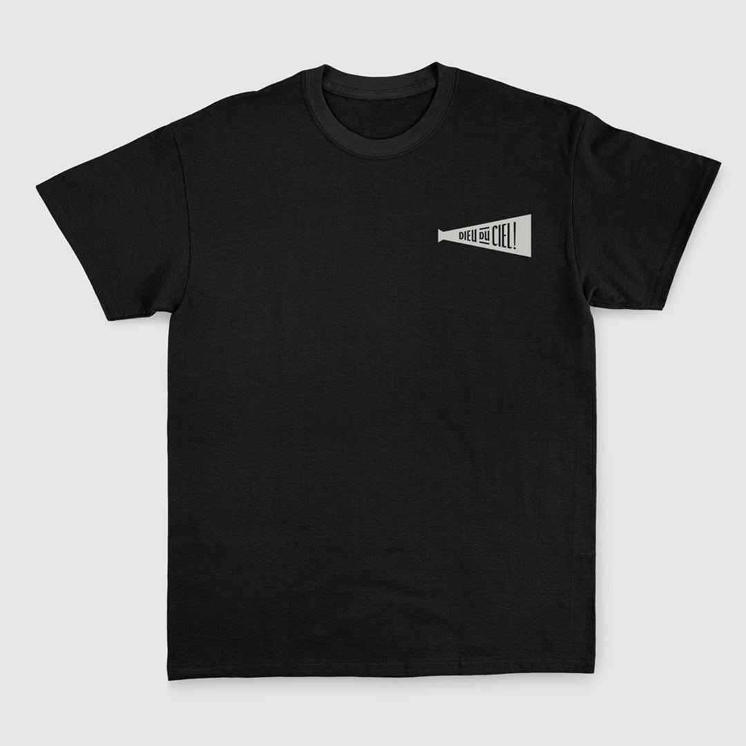 Unisex short-sleeve, crew-neck T-shirt. Classic fit. Light gray screen prints of the Dieu du Ciel! logo on the chest and the Journée Péché 2025 poster illustration on the back.